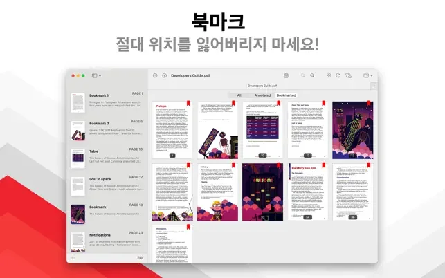 ∙ 북마크로 지정하거나 주석을 추가한 페이지의 개요를 탭 한 번으로 보기.