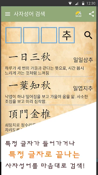 특정 단어가 들어가는 사자성어를 마음껏 검색할 수 있습니다.