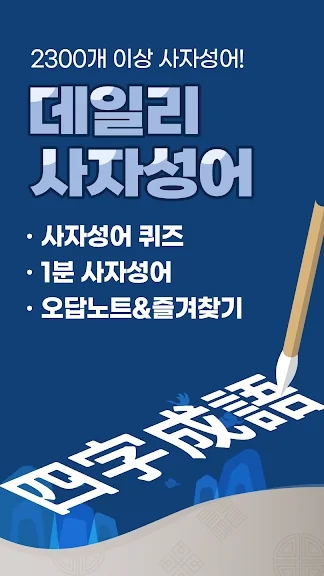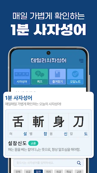 - 메인 화면에 바로 뜨는 "1분 사자성어"로 하루에 사자성어 1개씩 꾸준하게 학습합시다!