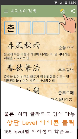 본 어플은 사자성어 급수는 "어문회"의 급수 기준을 원용하여 제작되었습니다.