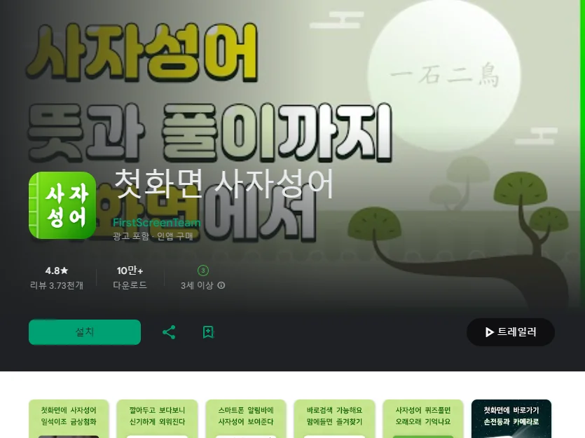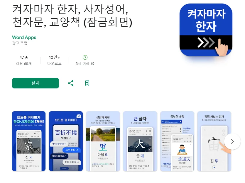 이 어플은 구글플레이스토어에서 "사자성어"로 검색했을때 5번째로 나오는 어플입니다. 아래는 켜자마자 한자, 사자성어, 천자문, 교양책 (잠금화면) 어플에 대한 자세한 설명이니 참고하세요.