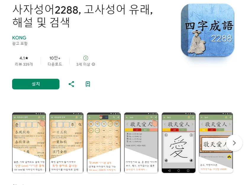 이 어플은 구글플레이스토어에서 "사자성어"로 검색했을때 3번째로 나오는 어플입니다. 아래는 사자성어2288, 고사성어 유래, 해설 및 검색 어플에 대한 자세한 설명이니 참고하세요.