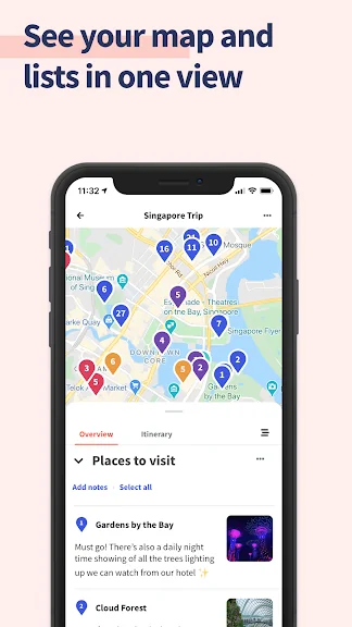 방문할 관광 명소를 추가하면 Google 기반 여행지도에 즉시 표시됩니다. 일정 조직과 지도 확인을 위해 여러 여행 앱이나 웹사이트를 찾을 필요 없이 Wanderlog에서 모든 작업이 가능합니다. 순서대로 장소 방문 시 지도상에 핀 사이 선이 연결되어 루트를 볼 수 있습니다 (데이트립에 적합). 모든 장소를 Google 지도로 내보낼 수도 있습니다.