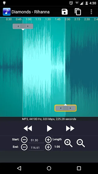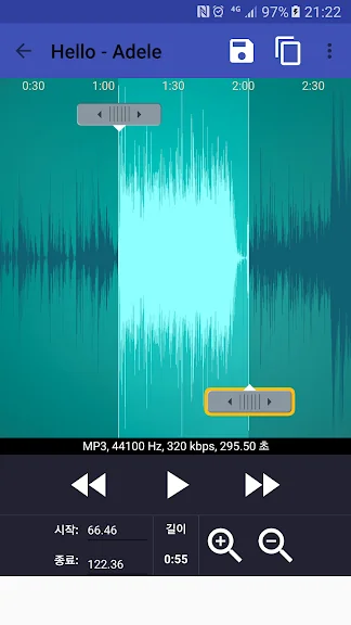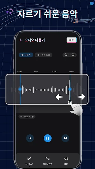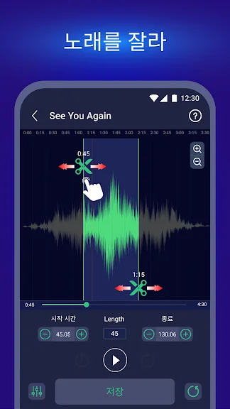 사용자는 시작점과 종료점을 화살표로 조정하거나, 직접 입력하여 정확한 위치를 설정할 수 있습니다. 또한, 간단한 터치로 시작과 종료 시간을 지정할 수 있어, 복잡한 과정 없이도 원하는 음원을 쉽게 편집할 수 있습니다.