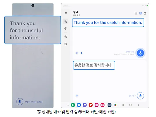 2단계) 듀얼 스크린 모드로 전환되며, 커버화면과 메인화면에 상대방 대화 및 번역 결과가 표시됩니다.