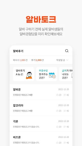 이 앱의 가장 큰 장점은 다양하고 풍부한 채용 정보와 함께 알바생들의 커뮤니티 공간이 마련되어 있다는 점입니다. 알바생끼리 소통하며 경험을 공유할 수 있는 ‘천국스토리’ 서비스는 고민 상담부터 기업 평판 확인까지 가능하게 합니다. 이를 통해 알바를 구하기 전에 실제 후기를 참고할 수 있어 더욱 신뢰할 수 있는 선택이 가능합니다.