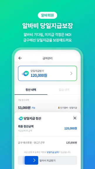 - 급여 미지급 걱정 없이 당일 정산을 원하는 분