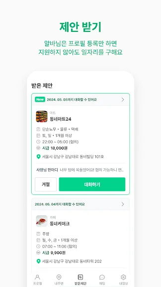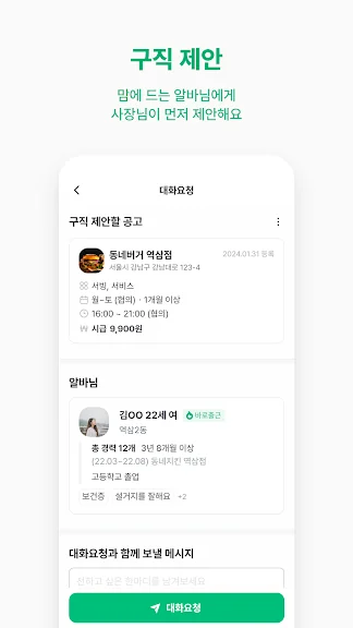 아르바이트 자리를 찾고 있다면, 사장님에게 근무 제안 받고, 공고에 지원 하세요!