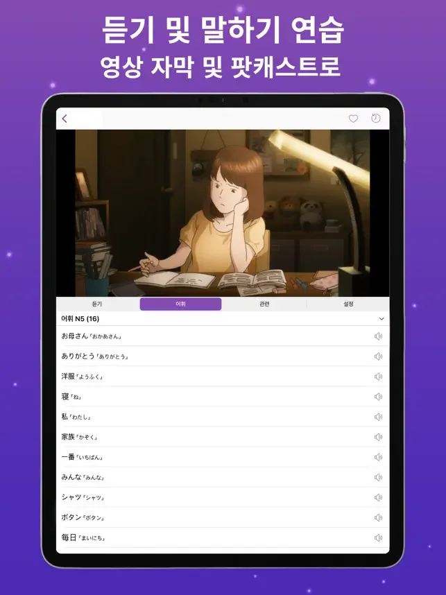 일본어 오디오 듣기 및 일본어 비디오 시청: 오디오 속도를 조절하고 읽기 음성을 변경하세요. 듣기 및 반복을 통해 JLPT 시험을 위한 듣기 및 발음 능력을 향상시키세요. 비디오 및 팟캐스트를 통해 일본 문화 학습 및 듣기를 연습하세요. 두 배의 즐거움을 위해 일본 노래를 통해 음악과 함께 일본어를 공부하세요.