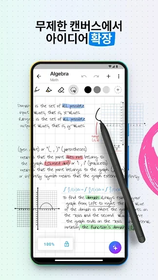 확대해도 흐려지지 않는 벡터 방식의 필기 엔진을 지원하며, 만년필과 볼펜, 형광펜 등 다양한 펜 형식을 지원합니다.