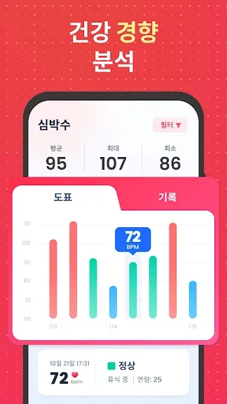 심박수: 심장 박동 측정기 어플에 대한 스크린샷 정보가 필요하시다면 아래 이미지를 참고하시기 바랍니다.