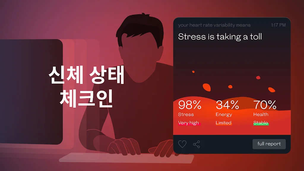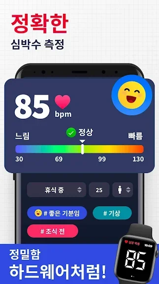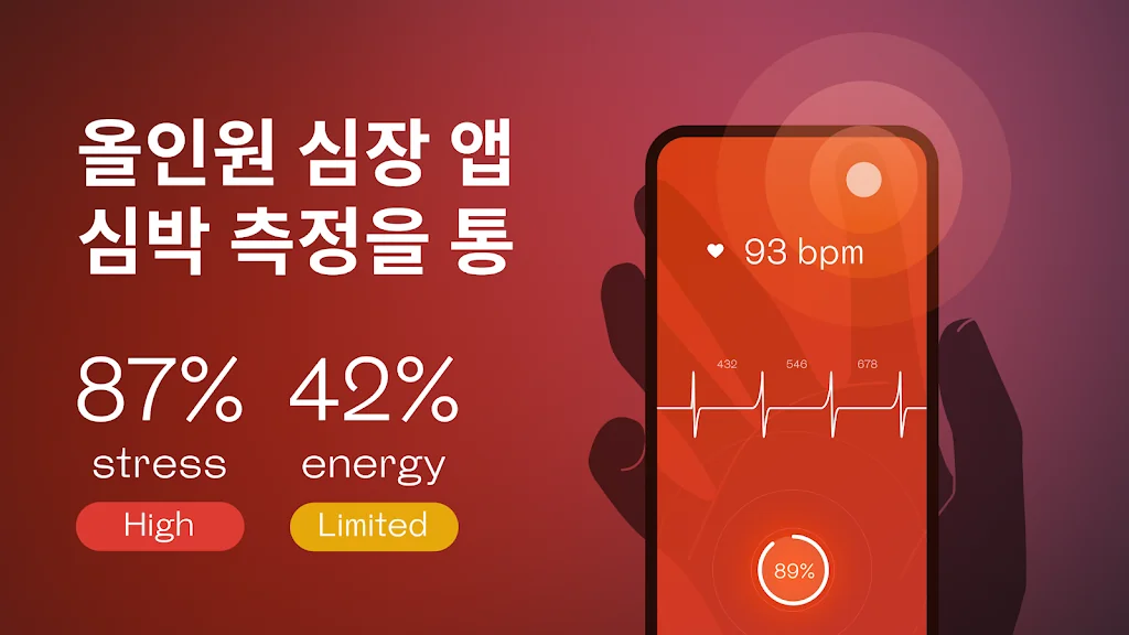 심박수 측정기의 과학적 디자인으로 즉각적인 심박수를 간편하게 측정하세요. 카메라에 손가락을 올려놓기만 하면, 지문 센서가 탑재된 심박수 측정기가 나머지 작업을 처리합니다. 심박수, 맥박, 스트레스 수준을 한 번에 측정할 수 있습니다.