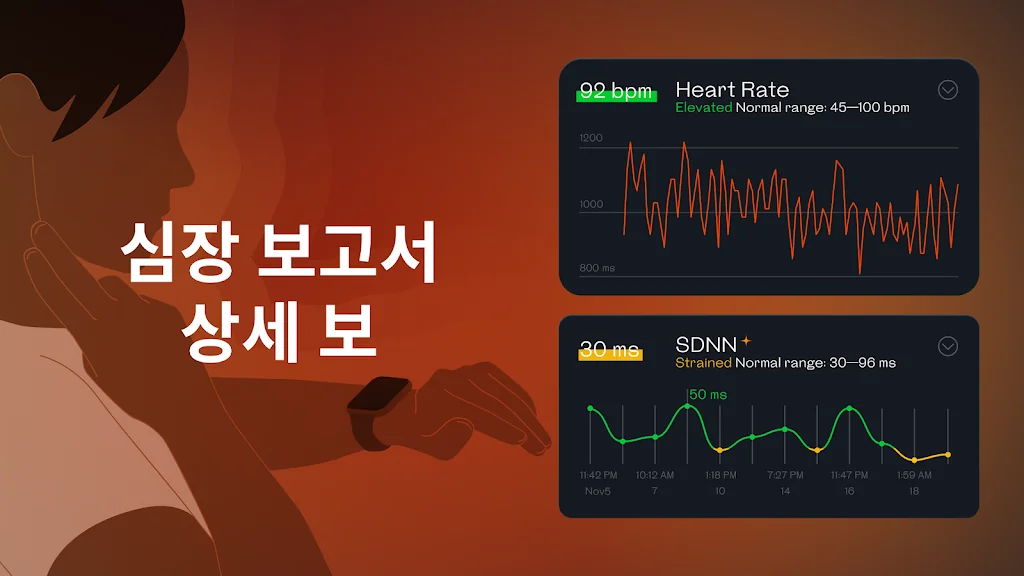 심박수 측정기는 혈압, 혈당, 심박수 수치를 시각적으로 쉽게 이해할 수 있도록 제공합니다. 원시 데이터를 통찰력으로 바꾸고, 전문가의 조언까지 받아보세요. 심박수 측정기로 건강 데이터를 해석하는 것이 이렇게 쉬운 적은 없었습니다!