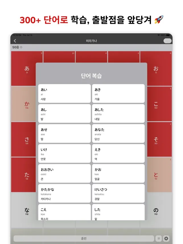 무료 버전: 모든 히라가나와 가타카나 학습 잠금 해제 가능, 종합적인 듣기 및 인지 훈련, 5번 실수 후 짧은 광고 보기