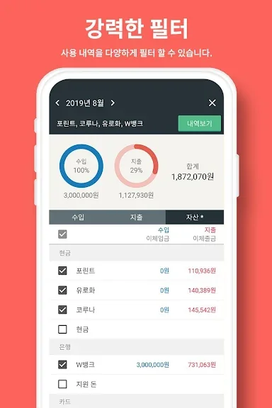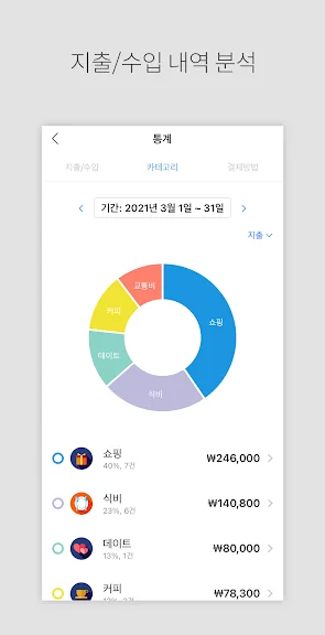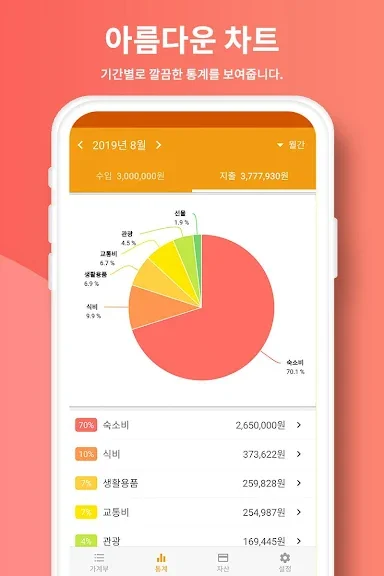 - 자산, 카테고리, 금액별로 나눠서 통계를 확인할 수 있습니다.