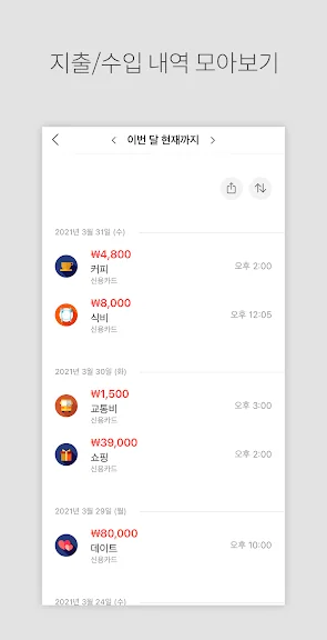 - 은행 및 카드회사 어플의 푸시 분석으로 내역을 입력할 수 있습니다.