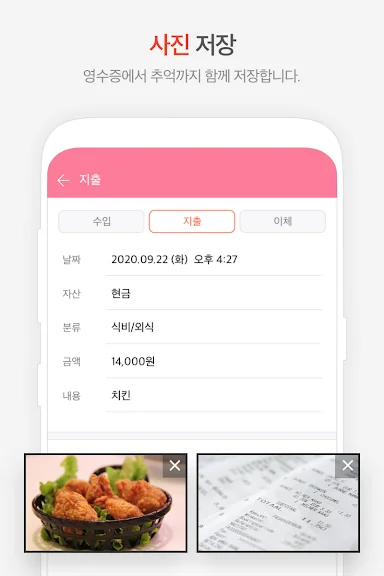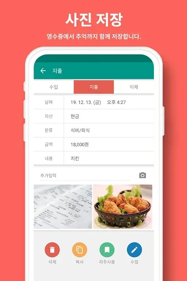 지출 내역에 영수증 사진첨부 및 메모기능, 날짜시간 등 상세한 내용 기록