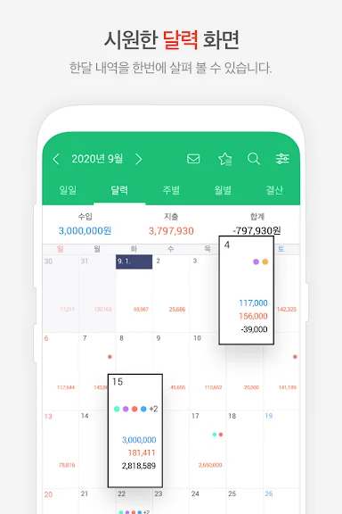 - 기본, 달력, 내역 화면의 제목(이달의 잔액, 총 자산, 월 잔액, 지출 합계)을 눌러서 보고 싶은 데이터를 선택할 수 있습니다.