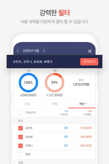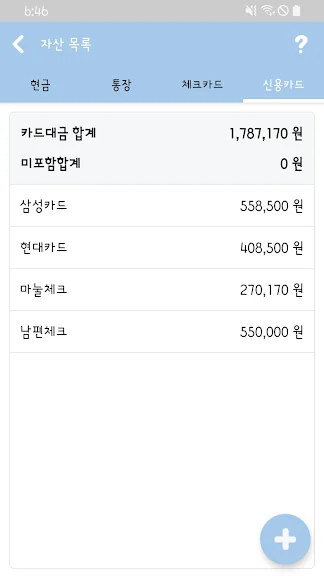 - 현금, 통장, 체크카드, 신용카드로 나눠서 자산을 관리할 수 있습니다.