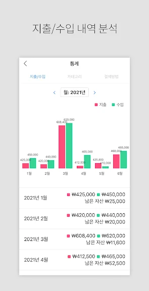 전체/1년단위/6개월단위/1개월단위 지출/수입 유형별 사용 내역 차트 기능 제공