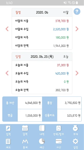 가장많이 쓴날, 가장많이 쓴달, 가장적게 쓴날, 가장적게 쓴달 등, 다양한 통계 제공과, 누적 지출/수입 내역 및 남은 자산 표시
