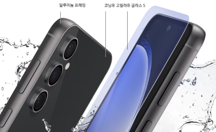 갤럭시 S23 FE는 외부 환경에서도 걱정 없이 사용할 수 있는 강력한 내구성을 자랑합니다. 전후면 모두 코닝® 고릴라® 글라스 5를 적용해 스크래치와 충격에 강하며, 알루미늄 프레임 구조로 설계되어 전반적인 내구성이 탁월합니다. 특히 IP68 등급의 방수방진 기능을 갖추고 있어 비가 오거나 물이 튀는 환경에서도 안정적으로 사용할 수 있습니다. IP68 등급은 수심 1.5m의 담수에서 최대 30분 동안의 방수 테스트를 통과한 인증이므로, 일상 생활에서의 물기나 먼지에는 충분히 대비할 수 있습니다. 물론 바닷물이나 수영장물에는 주의가 필요하지만, 기본적인 방수방진 성능만으로도 일상에서는 큰 만족을 줄 것입니다.