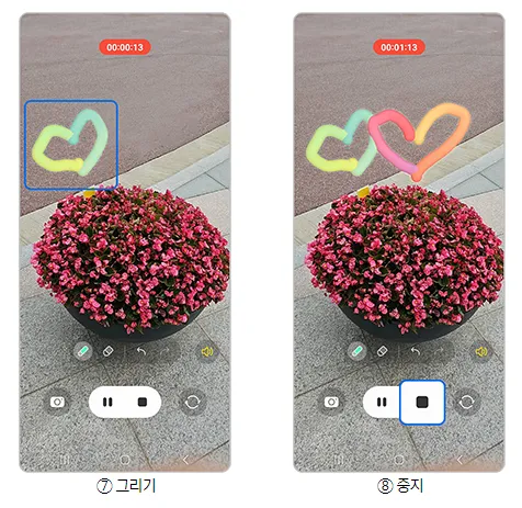 카메라 > 더 보기 > AR존 > AR 두들 > 카메라를 움직인다 > 동영상 촬영 > 그리기 > 중지