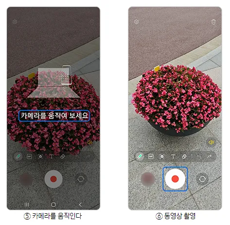 카메라 > 동영상 > AR 두들 아이콘 선택 > 카메라를 움직인다 > 동영상 촬영 > 그리기 > 중지