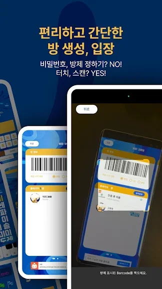 - 방제, 비번이 없이 방을 생성하고, 바코드 스캔만으로 빠르게 방입장이 가능합니다.