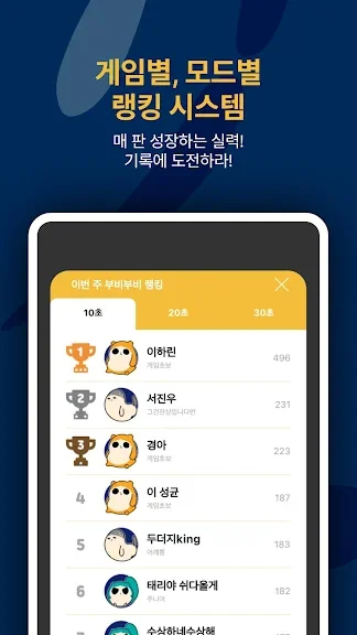 - 게임별 랭킹, 인싸랭킹, 지역랭킹 등 다양한 랭킹을 제공합니다.