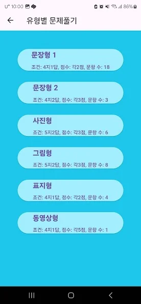 이 앱은 총 6가지 문제 유형별 연습 모드를 지원하여, 사용자가 부족한 부분을 집중적으로 보완할 수 있도록 구성되었습니다.