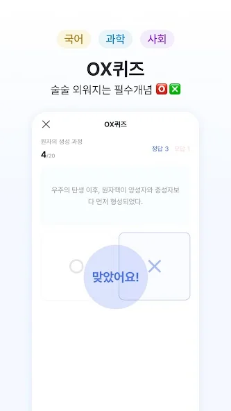 - OX 퀴즈 : 필수 개념을 게임처럼 즐기며 효율적으로 암기할 수 있습니다. 복습에 큰 도움이 됩니다.