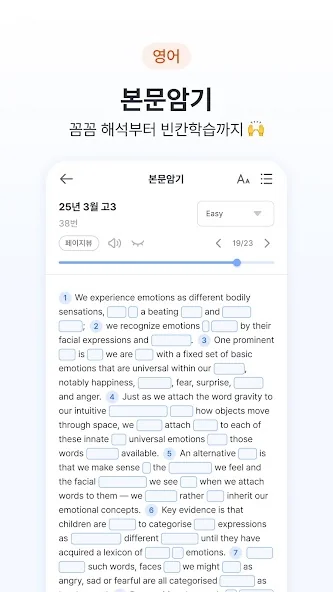 - 본문 암기 : 내신 영어는 본문 암기! 난이도별로 빈칸 갯수를 조절하며 본문을 암기할 수 있습니다.