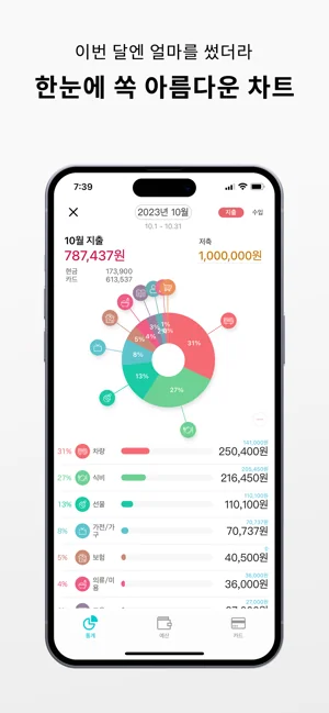 게다가 계좌와 카드 연결이 간편해서 수기 입력 없이도 수입과 지출 내역을 실시간으로 확인할 수 있어요. 어디에 돈을 많이 쓰는지 한눈에 파악할 수 있어서, 예산을 세우거나 지출을 조절하는 데도 큰 도움이 돼요.