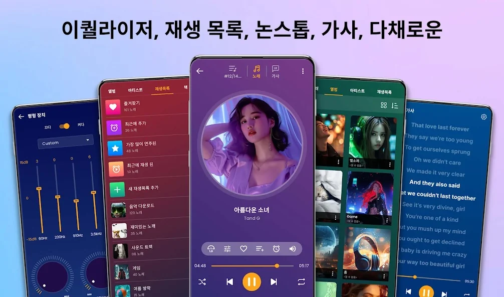 또한, 이퀄라이저와 테마 기능으로 음악의 사운드와 화면을 나만의 스타일로 꾸밀 수 있어요. 헤드폰이나 블루투스 기기와도 원활하게 연결되어, 언제 어디서든 고품질 음악을 즐기기 딱 좋답니다.