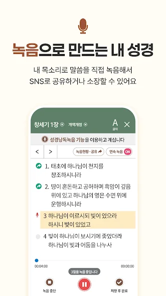 속도 조절 기능 덕분에 바쁜 아침이나 짧은 휴식 시간에도 편하게 들을 수 있고, 구절 복사나 공유, 북마크도 간단하게 할 수 있어서 성경 읽기와 묵상에 큰 도움을 줘요. 노트 기능도 있어서 중요한 구절이나 생각을 바로 기록할 수 있답니다.