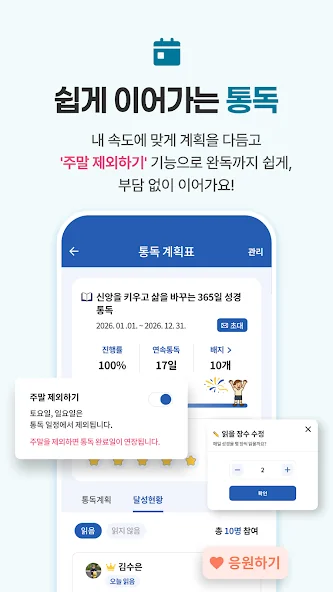 이 앱은 교회 성도들과 함께하는 통독 챌린지 기능도 제공해서, 서로 격려하며 목표를 세우기 좋아요. 성경 읽기 기록과 진행 현황을 실시간으로 확인하며, 성취감도 느낄 수 있죠. 깔끔한 디자인과 사용자 친화적인 기능 덕분에 누구든 부담 없이 사용할 수 있어요.