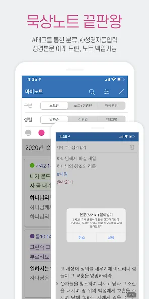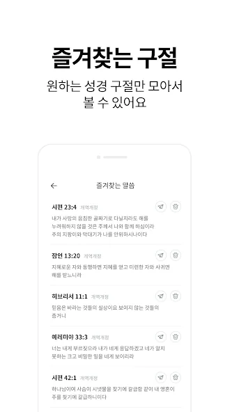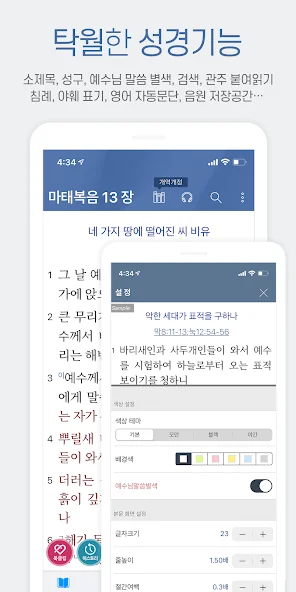 개인 맞춤형 설정도 간편해서, 좋아하는 색깔 테마를 선택하거나, 하이라이트와 노트를 활용할 수 있습니다. 성경 구절을 이미지를 만들어 공유하거나, 좋아하는 말씀을 북마크에 저장하는 것도 가능하니, 나만의 성경 공부 방법을 만들어보세요. 어떤 곳에서도 쉽게 말씀과 친해질 수 있는 좋은 도구입니다.
