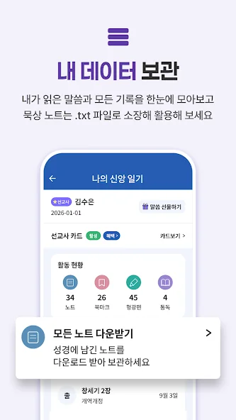 또한, 성경 통독 계획표와 묵상 노트 기능 덕분에 꾸준히 성경 읽기와 묵상을 실천할 수 있어요. 하루 15분씩 성경을 읽거나 들으며, 자연스럽게 영적 성장을 경험하게 되죠.