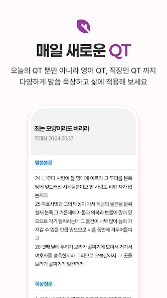 이 앱은 다양한 성경 번역본을 한 곳에서 만나볼 수 있어요. 개역개정, 새번역, ESV, NASB까지 총 21가지 번역본이 무료로 제공되어, 성경 공부나 비교 읽기에 편리하답니다. 음원과 악보도 함께 있어서 찬송가도 쉽게 접할 수 있어요.